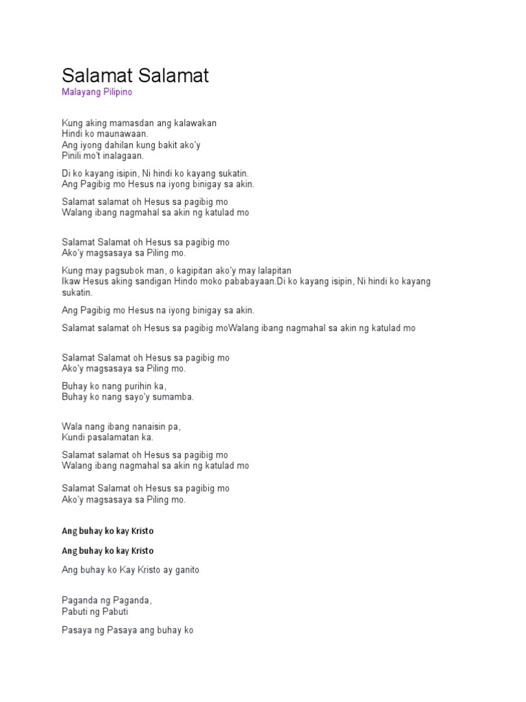 Basis B - Bb - A - G Bm Faug Hindi ko kayang isipin Bm7 Hindi hindi ko kayang BmG sukatin Em Fm Ang pag-ibig Mo. Find Salamat Salamat Salamat lyrics and search for Salamat. Salamat Salamat Oh Hesus sa Pag-ibig Mo Walang ibang nagmahal sa akin na katulad Mo Salamat Salamat Oh Hesus sa Pag-ibig Mo Akoy magsasaya sa piling Mo Verse 2 Kung may pagsubok man o kagipitan Ako ay may lalapitan Ikaw HESUS ang aking sandigan Hindi mo ko pababayaan refrain chorus.