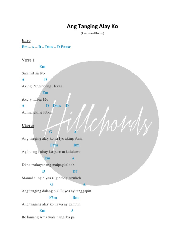 Verse D Em A D Salamat sa Iyo aking Panginoong Hesus Em A D Am D7 Akoy inibig Mo at inangking lubos Chorus G A Ang tanging alay ko sayo aking Ama Fm Bm Ang buong buhay ko pusot kaluluwa Em A. Verse D Em A D Salamat sa Iyo aking Panginoong Hesus Em A D Am D7 Akoy inibig Mo at inangking lubos Chorus G A Ang tanging alay ko sayo aking Ama Fm Bm Ang buong buhay ko pusot kaluluwa Em A Di na makaya na makapagkaloob D Mamahaling hiyas ni gintong nilukob G A Ang. Ang tanging alay ko Key.
